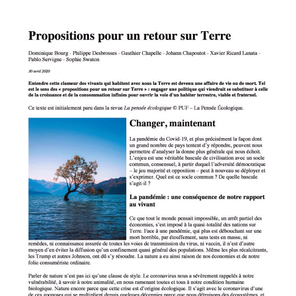 3 - "Propositions pour un retour sur terre". Dominique Bourg - Philippe Desbrosses - Gauthier Chapelle - Johann Chapoutot - Xavier Ricard Lanata - Pablo Servigne - Sophie Swaton) est beaucoup plus radical et utopique. (cliquer pour voir le pdf ci-joint)