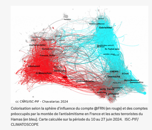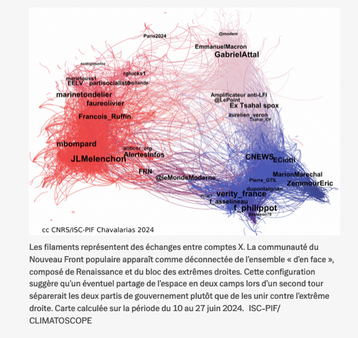 Selon David Chavalarias, directeur de recherche au CNRS, le front républicain s’est inversé sur le réseau social X (ex-Twitter) : ce n’est pas le Rassemblement national (RN) mais le Nouveau Front populaire (NFP) qui est désormais la force politique la plus exposée au barrage pour le second tour des législatives. Explications.
